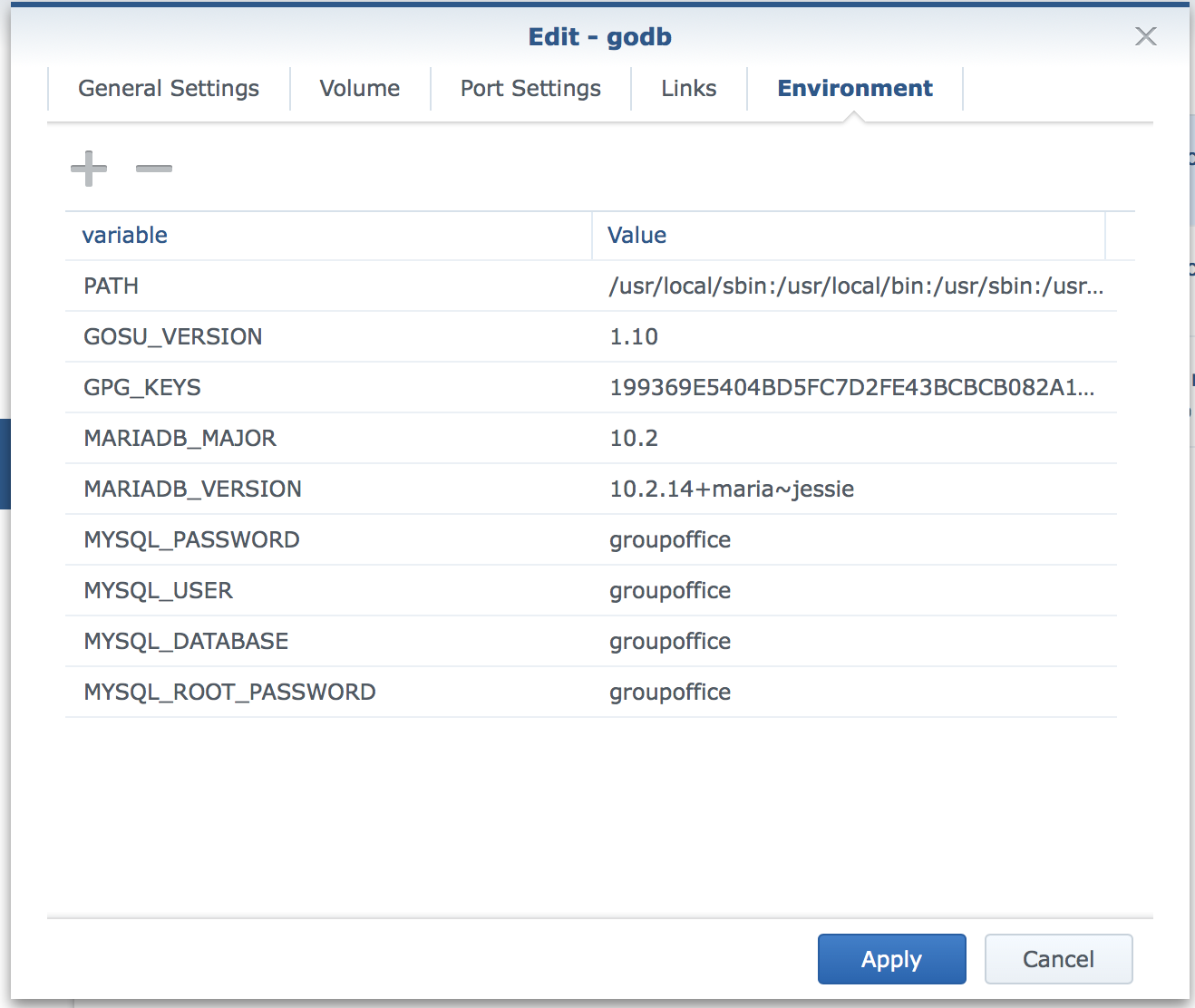 Hotovo. Teď zastavte oba kontejnery, jděte do pokročilých nastavení a zeditujte i v intermesh-groupoffice1 i v mariad db proměnné pro uživatele a heslo. Níže je ukázka
