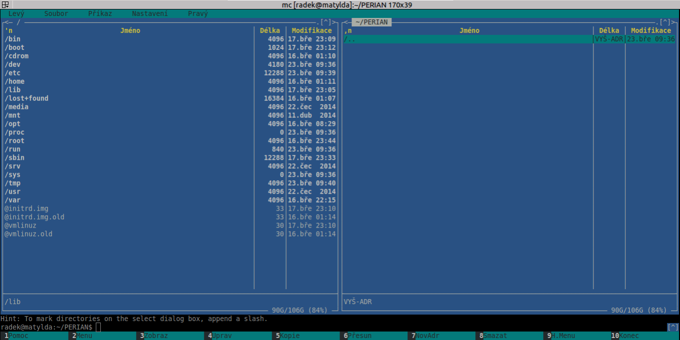 Po nainstalování MC a Zadání příkazu „mc“ v terminálu se Vám otevře nový svět pracovních možností v typicky DOSovském grafickém rozhraní, které je vynikající v tom, že neruší Vaši pozornost.